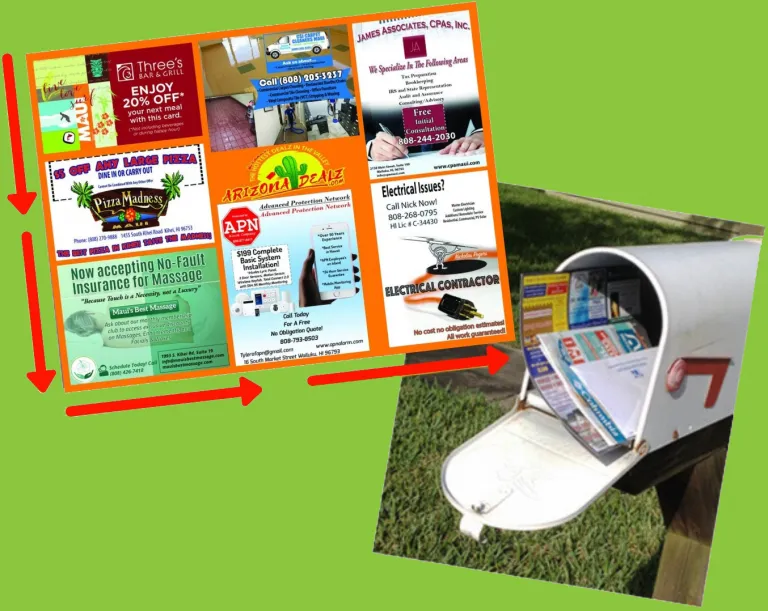 Your ad will be on a large 9×12 inch postcard (Yes, the cards are big, and they will fit in the mailbox!); the largest piece of paper that can be mailed without being folded. Your message is guaranteed to be read with our 100% Open Rate Guarantee! (as there is no envelope to open). Every advertisement is in plain view on the jumbo two-sided coupon mailer!